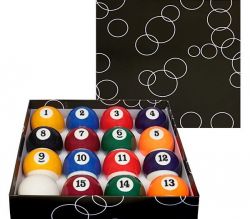 - Для пула. Полевой комплект составляют 15 бильярдных шаров. Из них один черный («восьмерка»), остальные окрашиваются в разные цвета (синий, красный, оранжевый, зеленый, желтый, фиолетовый, коричневый), причем 7 штук обладают сплошным рисунком, 7 имеют цветные полосы. Биток традиционно белый. Вес каждого изделия составляет 166–171 г, диаметр — 57,2 мм.